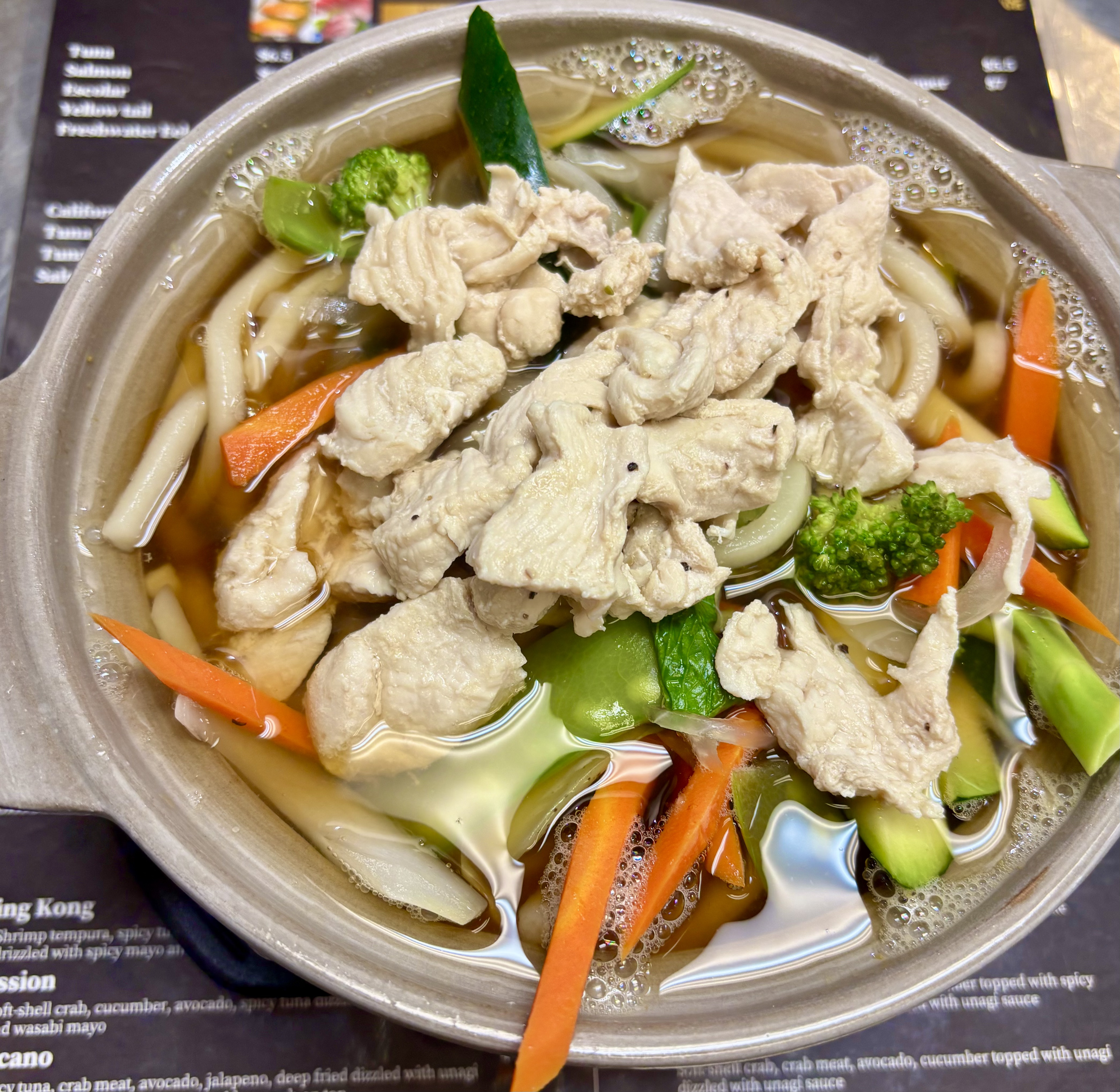 Served with miso soup, salad, 2pcs gyoza, shrimp tempura, and rice + 6pcs Sashimi and 4pcs California roll