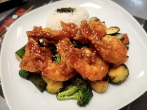 Batter fried jumbo shrimp tossed in sweet garlic sambal sauce with sautéed vegetable and rice